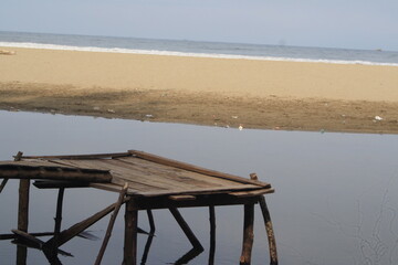 dramatic coastal scene depicting aftermath of storm, featuring dilapidated pier surrounded by turbulent waves and debris. moody sky adds to intense atmosphere