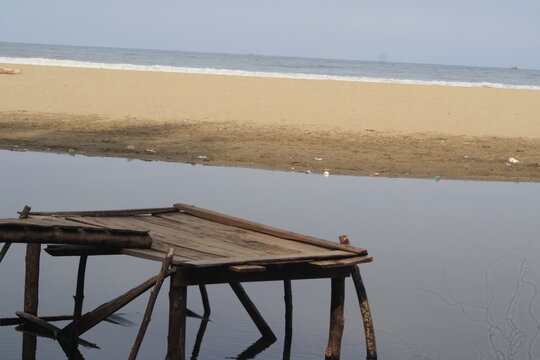 Dilapidated Pier in the Red Sea. Tiran Island on Backdrop.