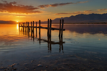 A serene sunset over a calm lake with a dilapidated wooden pier, reflecting the warm colors of the sky and distant mountains