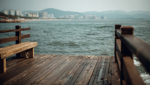 A sun-drenched wooden pier extends into a vibrant turquoise sea. Gentle waves lap against the structure, offering a tranquil scene of coastal serenity.