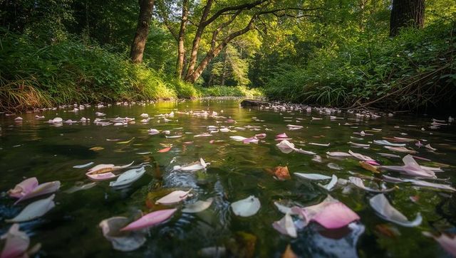 Sunlit rose petals drifting on mossy forest creek at golden hour, tranquil woodland stream