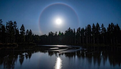 Serene forest river reflection capturing the lush greenery tall trees tranquil water and peaceful nature scene with a moody ethereal atmosphere in a scenic landscape