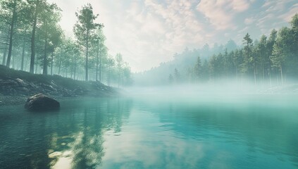 Serene mountain landscape with mist over blue lake