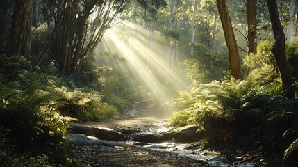 Sunbeams illuminate lush foliage, creating an ethereal, tranquil forest scene, capturing the essence of nature's serenity.