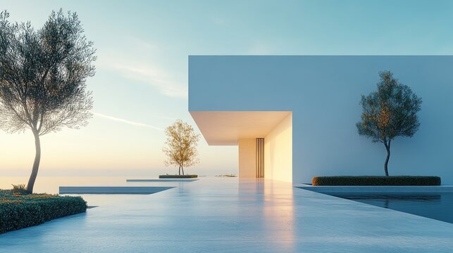 Modern white minimalist luxury beach house with infinity pool overlooking tranquil ocean at sunset