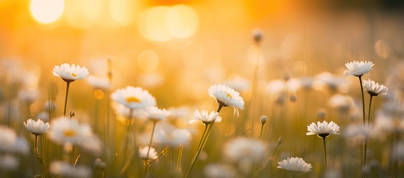 The landscape of white daisy blooms in a field, with the focus on the setting sun. The grassy meadow is blurred, creating a warm golden hour effect during sunset and sunrise time.