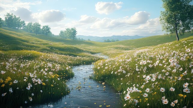 A tranquil stream flows through a lush meadow with wildflowers under a blue sky.