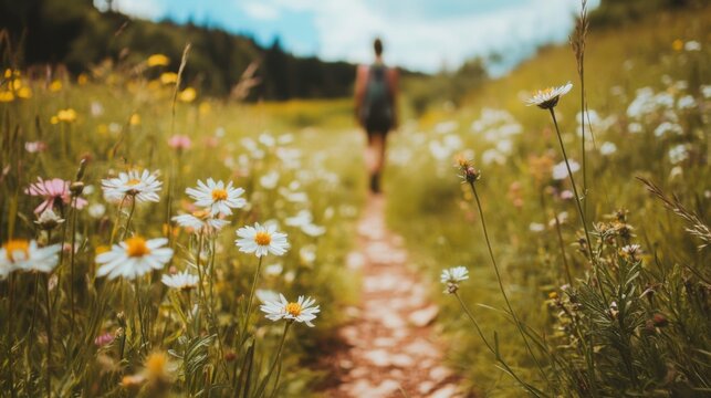 A person walking along a flower-lined path in a vibrant meadow under a blue sky