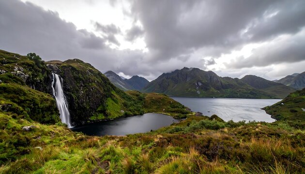 Scenic highland landscape with waterfall, lake, and mountains under a cloudy sky
