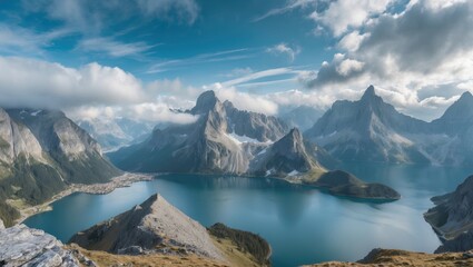 Majestic mountain landscape featuring a serene lake and dramatic peaks under a cloudy sky with space for descriptive text.