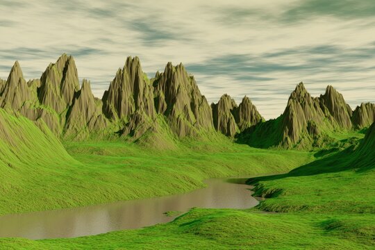 Misty mountain valley with serene river and lush green forests under a cloudy sky