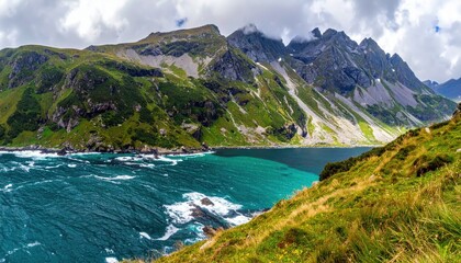 Dramatic panoramic landscape features a stunning turquoise lake nestled amongst majestic, rugged mountain peaks and verdant green slopes, under a cloudy sky adding depth and texture to the scene.