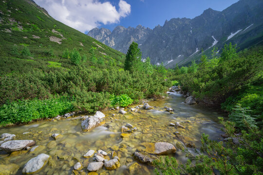 View of a clear stream flowing through a verdant valley, embraced by rugged mountains and a bright sky in Tatranska Javorina, Presovsky kraj, Slovakia.