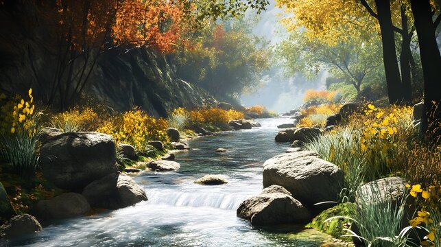 65. "A picturesque 3D scene of a tranquil mountain stream flowing through a forest with vibrant foliage