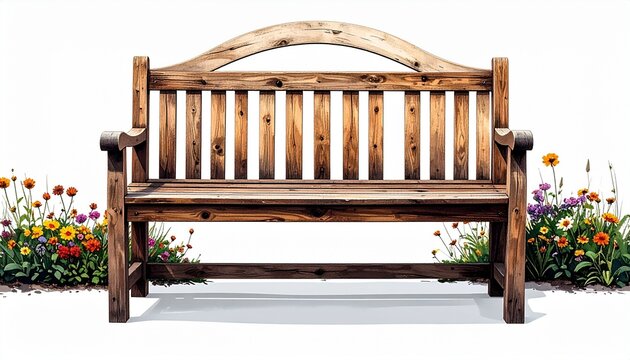 “Wooden garden bench surrounded by lush greenery and colorful flowers on paved path”