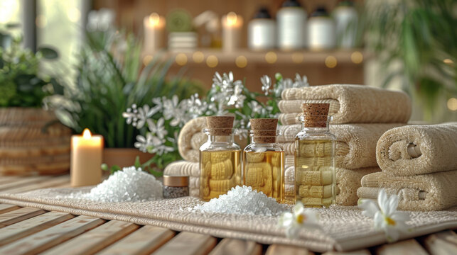 Relaxing spa products, towels, oils, and salt create serene atmosphere