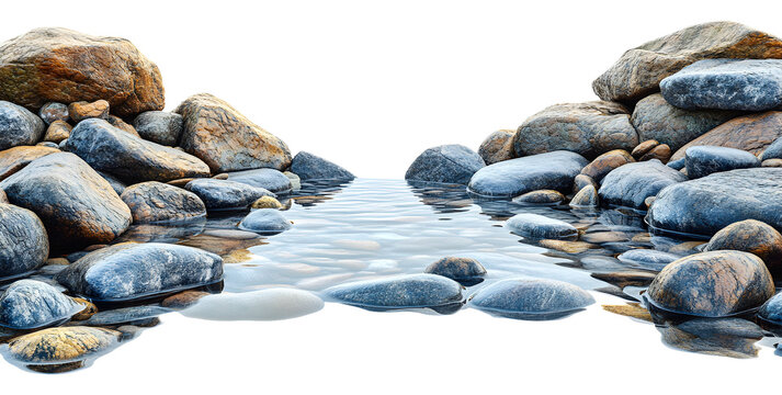 A tranquil stream flowing between smooth stones at sunrise isolated on transparent background
