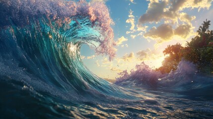 Dramatic Ocean Wave Crashing at Sunset Vibrant Colors Powerful Nature Scene