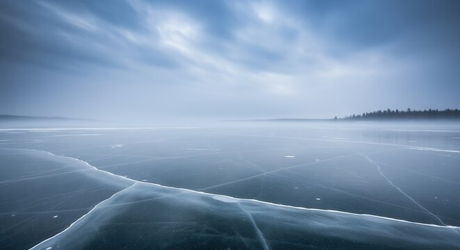 Vast frozen lake with cracked ice surface under a cloudy winter sky and distant trees