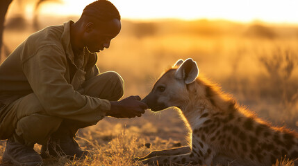Veterinarian preparing to treat a tranquilized hyena on open plains, cautious expression, soft morning light