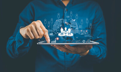 Businessman, simulated hand touch Concepts of global network technology, management of communications, relationships, exchange of transactional data. Customer service across media networks, online
