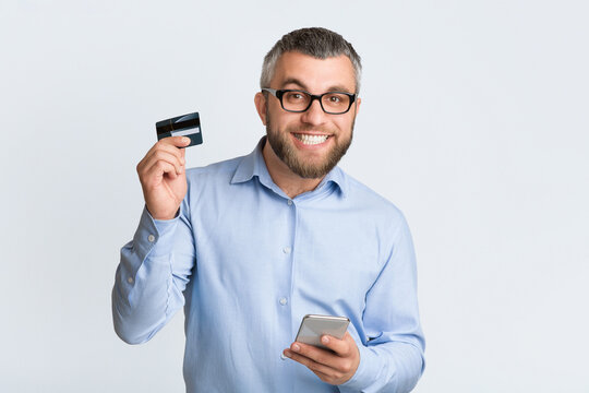 A man is depicted holding a credit card in one hand and a cell phone in the other hand. He appears to be engaged in a transaction or making a purchase online.
