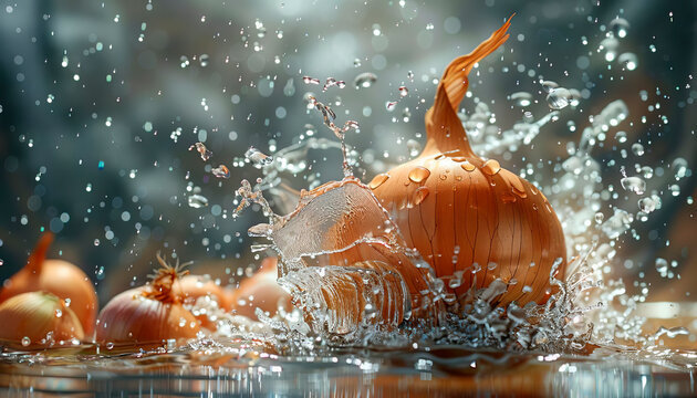 a onion being hit by a splash of water, with droplets flying off in all directions and layers separating