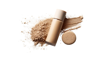 Foundation bottle, loose powder, and compact on white isolate background.