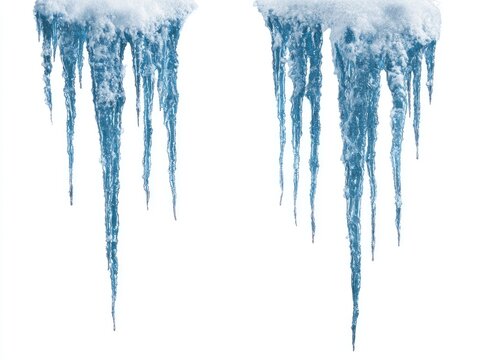 Two icy blue icicles with melting snow tops, isolated on white