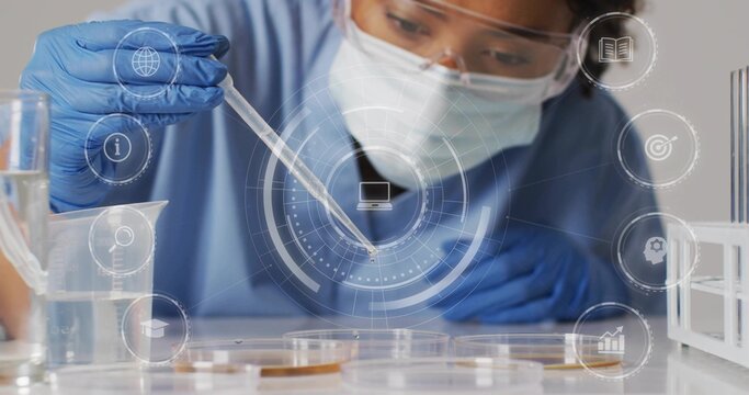 Pipetting lab tech moving drop into petri dishes on lab bench, wearing blue gloves mask and goggles