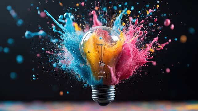 An illuminating light bulb is surrounded by a burst of vibrant paint colors, illustrating creativity, inspirational ideas, and artistic expression in a modern style.