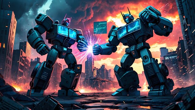 Cybertronian Showdown: Two imposing Transformers clash in a futuristic cityscape, their metallic forms glowing with energy as they engage in a battle for dominance.