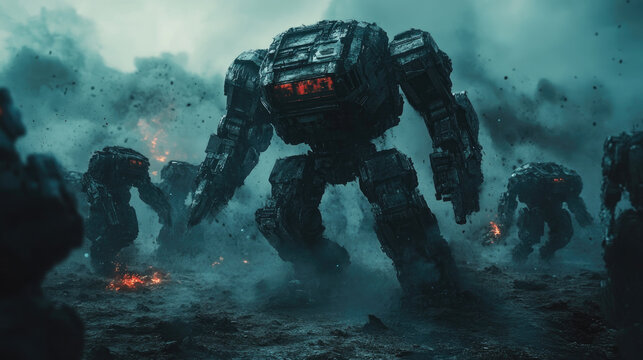 Concept of futuristic battle between transformer robots using advanced future weapons, dynamic science fiction scene, copy space