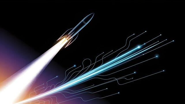 Rocket launch with vapor trail transforming into intricate glowing network – Perfect for global reach, digital infrastructure, or high-speed data.