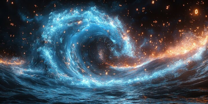 A cascade of water from a fountain that transforms into a stream of numbers. Concept of time flowing. Generative Ai.