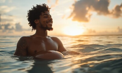 Pregnant transgender man cradling his baby bump. Happy African American trans man on a beach vacation, swimming in the sea. Celebrating LGBTQ+ inclusivity in pregnancy and Pride, Generative AI