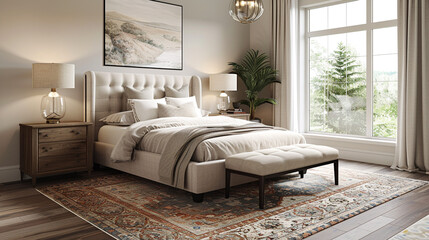 A transitional bedroom with a cozy, inviting atmosphere, featuring a tufted grey headboard, white linens, and a dark wood dresser.