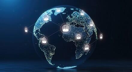 Global social network concept with digital graphic user symbols connected by lines on blue world map background. 3D rendering