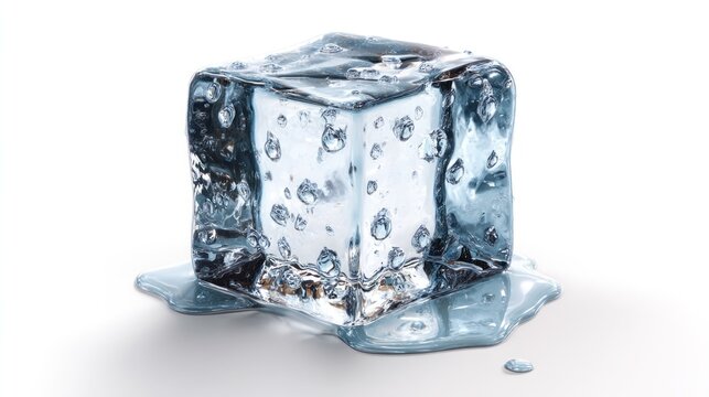 A nearly-cubic ice cube, glistening with trapped air bubbles, rests on a white surface; a small pool of meltwater surrounds its base, indicating thawing.  The cube displays clarity and translucency