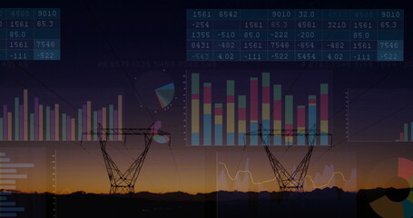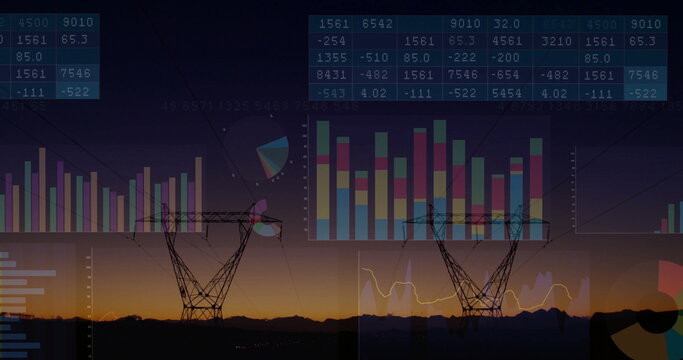 Displaying two steel power transmission towers against mountains at dusk, with faded bar charts