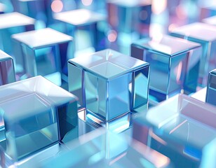 A close-up view of numerous translucent teal glass cubes and blocks arranged geometrically on a reflective surface.