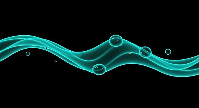 Glowing teal wave with translucent bubbles on a black background. Fluid, abstract design elegant and modern. Perfect for various digital applications.