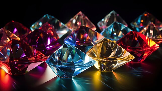 Colorful shiny gemstones on black background. Red, blue, green, yellow and purple gems.