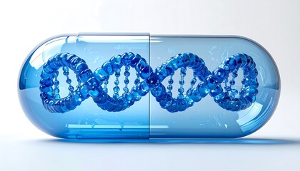 A close-up of a translucent blue capsule with a DNA double helix inside