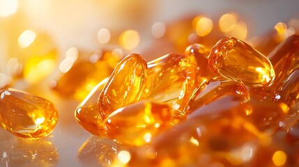 Glass jar with amber capsules on beige background, one capsule placed outside.