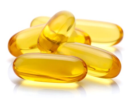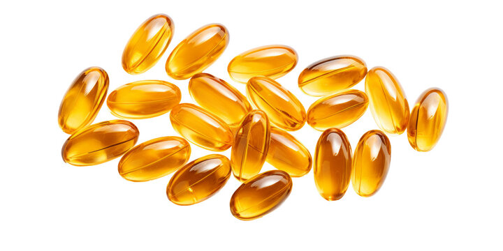 Closeup of translucent amber and yellow omega 3 fish oil capsules on white background