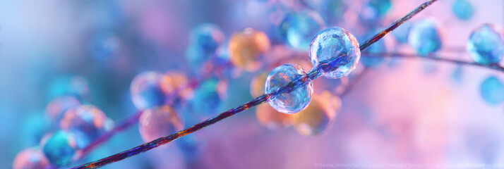 A microscopic view of a complex molecular chain with translucent blue spheres on a central strand.