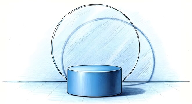 A minimalist artistic sketch featuring a blue cylindrical podium with two overlapping translucent circles in the background, highlighting geometric shapes, light shading, and creative design elements.