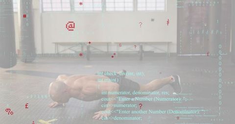 Shirtless athlete doing push-up on industrial gym floor with code overlay, fitness tech