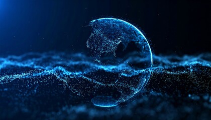 A translucent, glowing digital earth sphere with interconnected nodes against a dark background